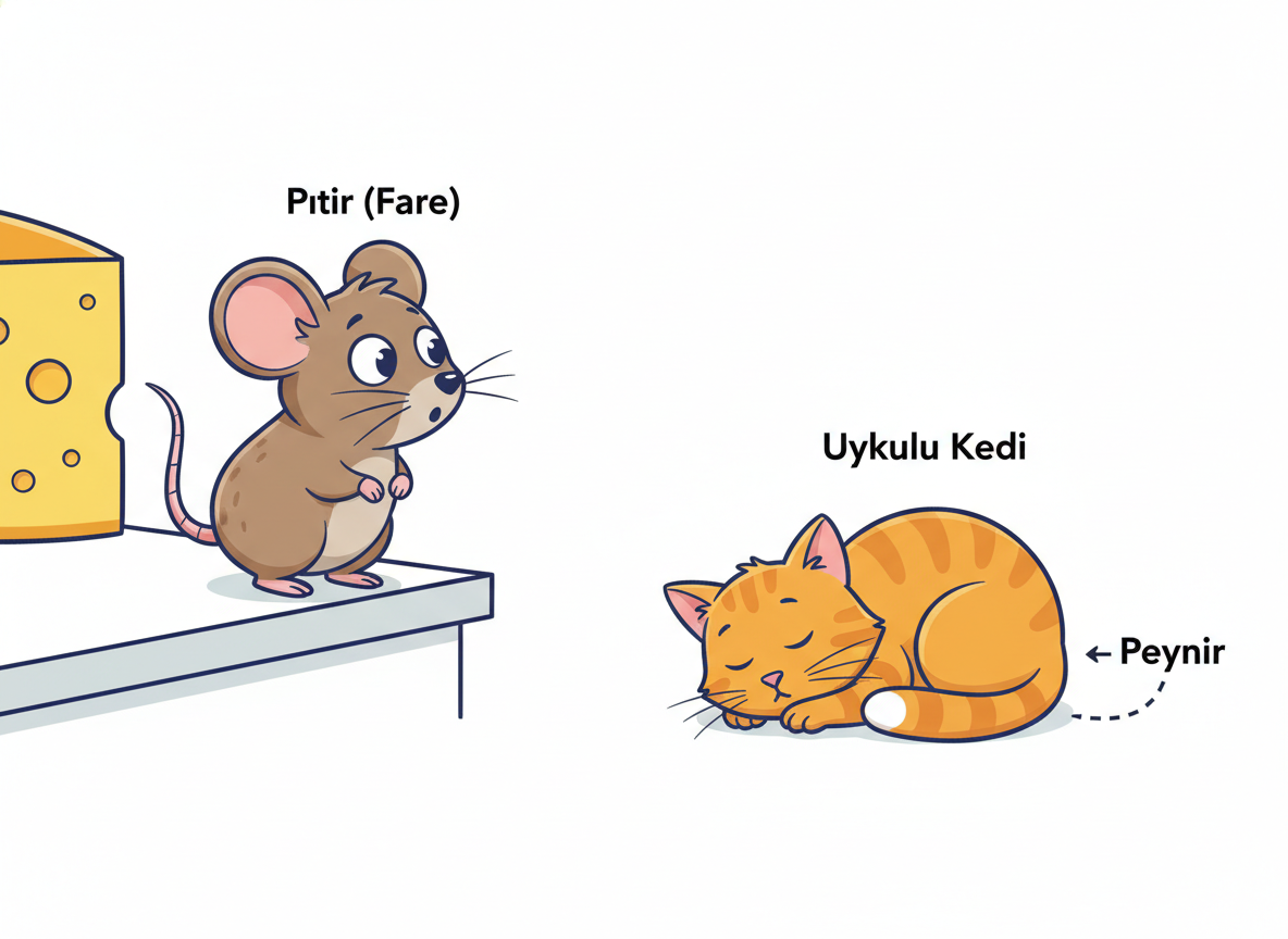 Minik fare Pıtır, peynir aramak için mutfağa girdi. Mutfağın ortasında kocaman bir kedi uyuyordu. Pıtır çok korktu ama aç olduğu için peyniri bulmaya karar verdi.